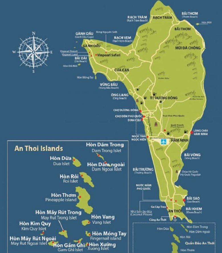 (This map is ideal for international visitors, tour guides, and travelers renting self-drive cars. Phu Quoc maps in English usually use place names such as:)